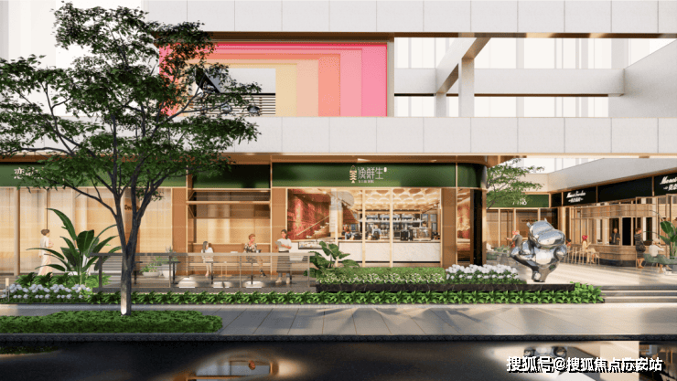 在空间上,项目让出城市街角空间形成街角绿化社区名片,约75米超长尺度城市街区生活形象,打造城市温情归家界面。同时利用项目自持的约500㎡商业配套,为业主提供家门口的休闲与便捷,也能触发更多的社交可能。