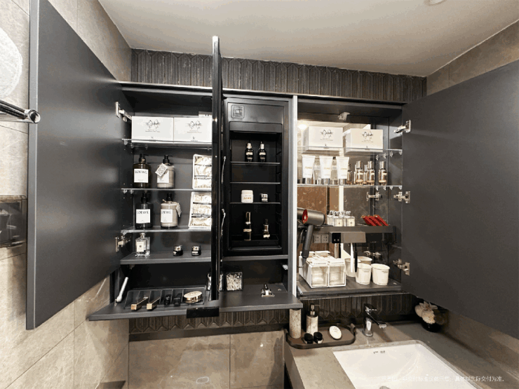 衣柜 巧用门后垂直空间 ,设置大量挂衣区与 双面柜体 ,实现空间翻倍;主卫镜柜分层设计搭配分隔盒收纳护肤品,地柜采用抽屉式设计并内置防水收纳盒,分类存放清洁用品,细节满满。