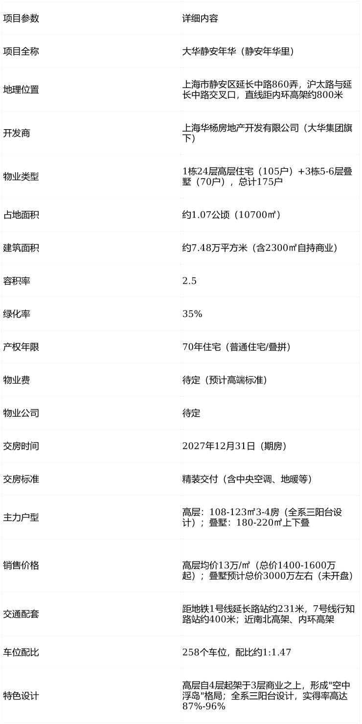 大华静安年华是静安区内环旁稀缺的低密改善型项目,以创新三阳台户型、双地铁便捷交通和优质教育医疗配套为核心竞争力,适合追求内环旁成熟生活圈与高品质居住体验的改善型家庭。然而,社区规模偏小、部分楼栋可能受噪音影响、价格门槛较高以及期房交付等问题也需要潜在购房者综合考量。对于预算充足、注重户型设计与交通便利性的买家来说,该项目仍是静安区难得的优质新房选择。