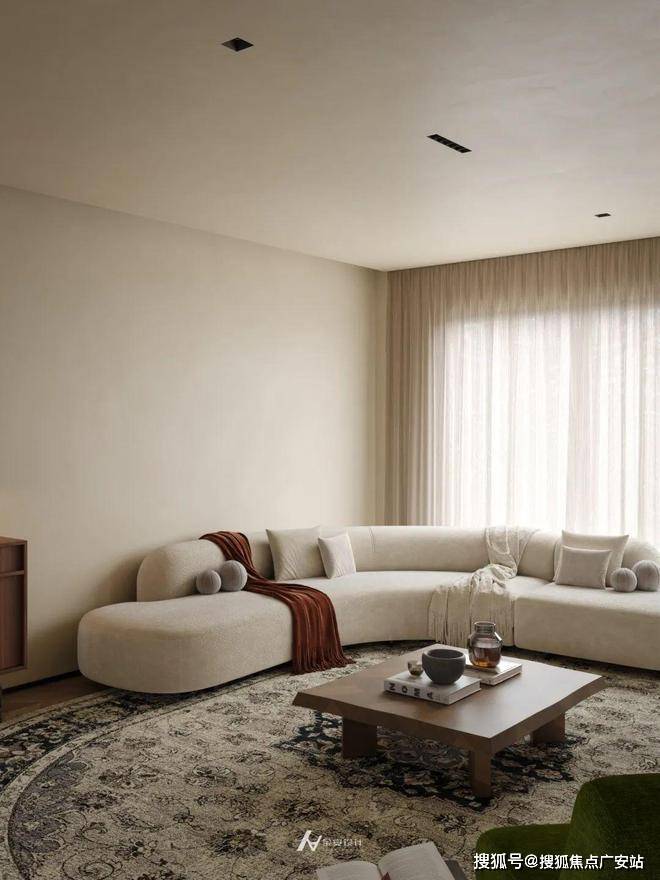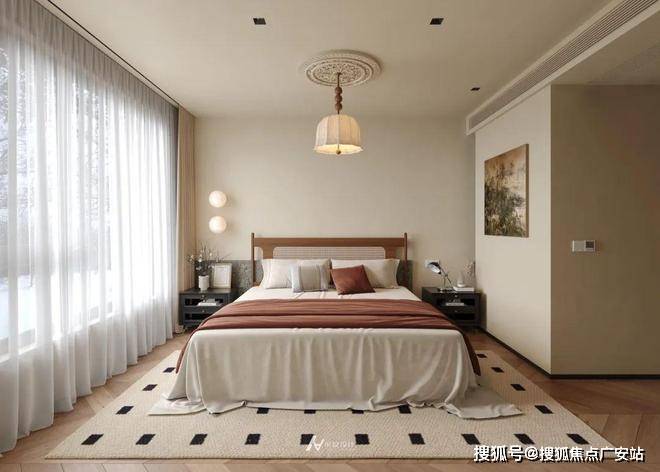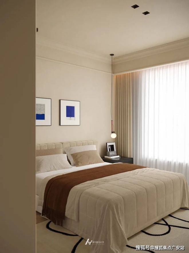 次卧以柔和米调为底色,营造静谧氛围。搭配同色系软包床头,浅棕床搭增添层次感。墙面双幅蓝白挂画点缀,打破单调。单侧悬浮床头柜简约实用,垂吊小灯设计精巧。大面积窗幔引入充足光线,地毯曲线元素柔化空间,整体布局简洁舒适,兼具温馨与雅致,适配休憩、客房等功能 。