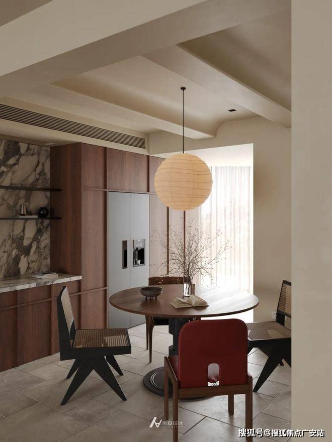 客厅、餐厅、餐厨区流畅贯通。客厅以壁炉营造温馨氛围,餐厅借圆形餐桌与球形吊灯构建聚合场景,二者通过顶面线条、地面材质(客厅人字拼地板/餐厅规整地砖 )自然过渡。餐厨区嵌入木质柜体与大理石背景墙,收纳与美观兼顾,各功能区既相对独立,又因开放格局深度融合,打造出互动性强、通透开阔的现代家居生活场景 ,让空间在视觉与使用体验上都更具延展性。