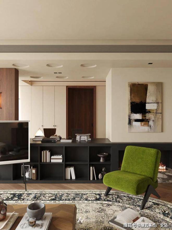 将客厅与复合功能连接一体,以人字形拼花地板串联整体,实现空间自然过渡。一侧打造一体化书桌+收纳柜体,满足办公与置物需求; 另一侧借落地窗引入充足光线,布置休闲躺椅区,营造松弛氛围。 顶面通过线性灯、圆形风口划分区域,既保证空间通透连贯,又以功能区的相对独立,构建出“办公 - 休闲 - 收纳” 有序且融合的生活场景,诠释简约高效的现代空间利用逻辑。