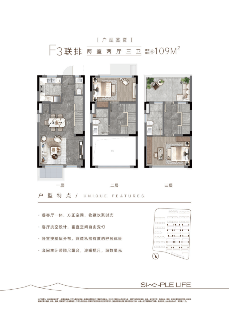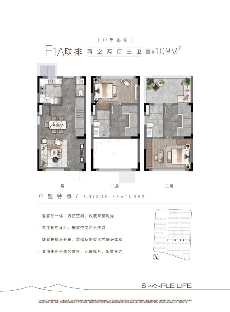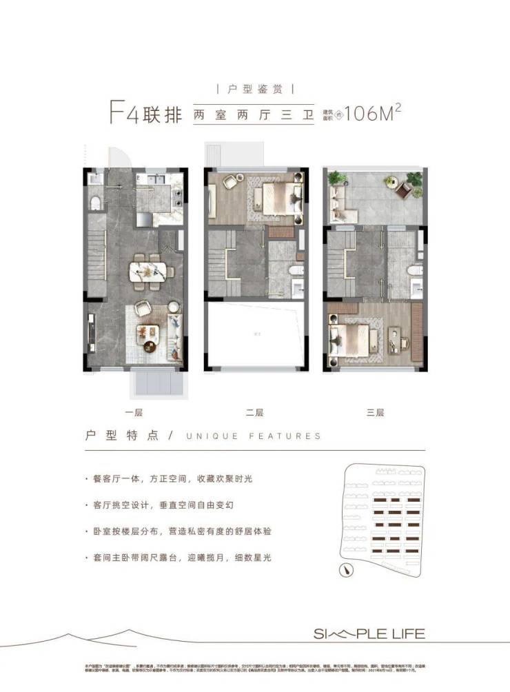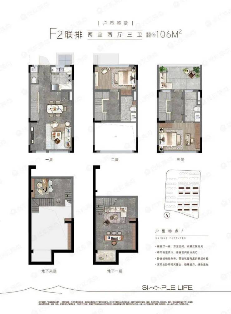 主力联排户型(106-109㎡)赠47㎡高5.2m地下室,得房率达100%,部分户型还带南向花园与星空露台,空间利用率高