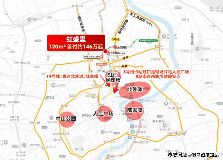 三轨交环绕形成高效通勤网—— 直线距离3号线江湾镇站约500米 ,3站虹口足球场/7站人民广场/8站南京西路/9站静安寺; 直线距离20号线万安路站约150米(在建)/直线距离南北大动脉19号线车站南路站约900米(在建) ,未来可直达北外滩、陆家嘴。