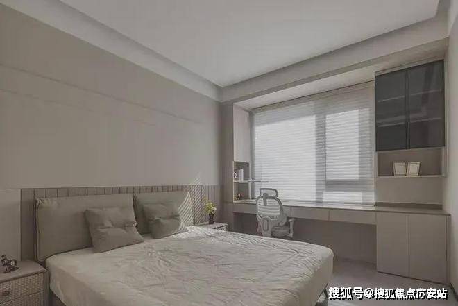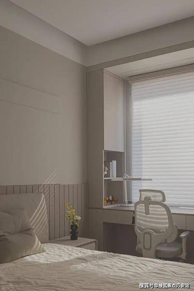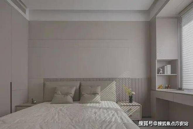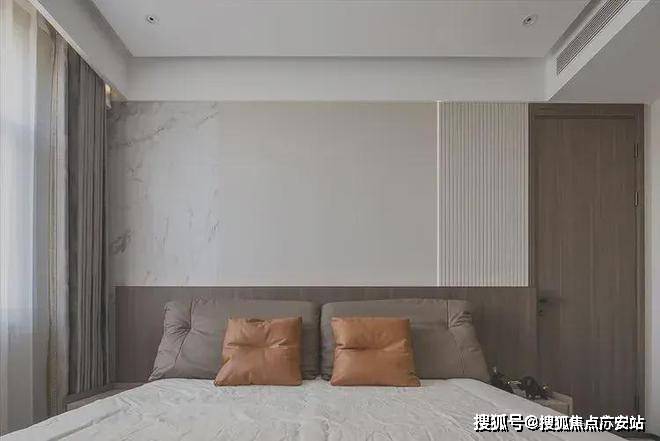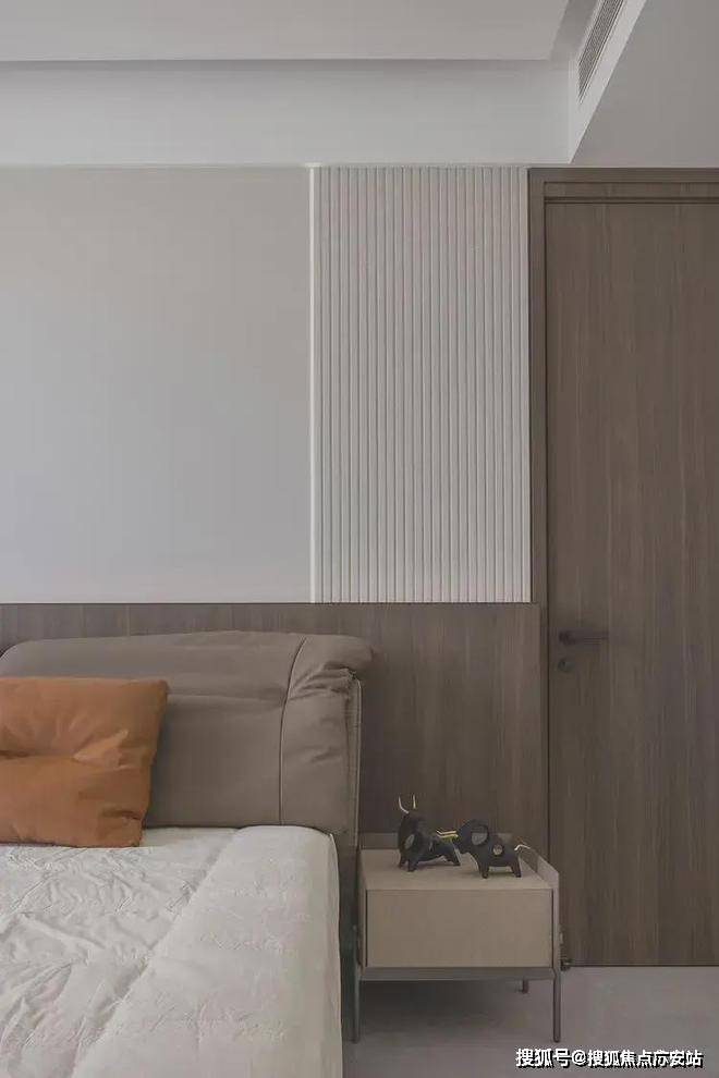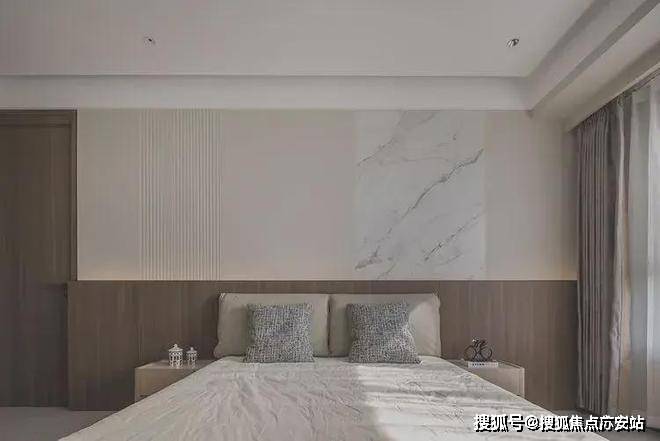 主卧背景墙层次丰富,木饰面护墙板温暖围裹睡眠区,骨格线勾勒出质感,白色岩板点缀给人足够的安全感,整体细腻的质地视觉可见。