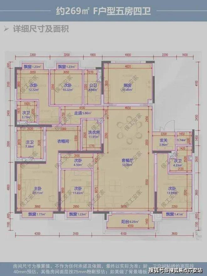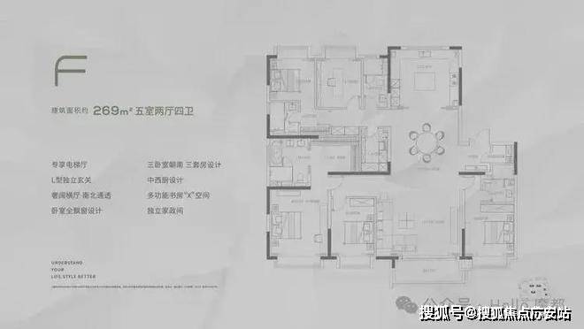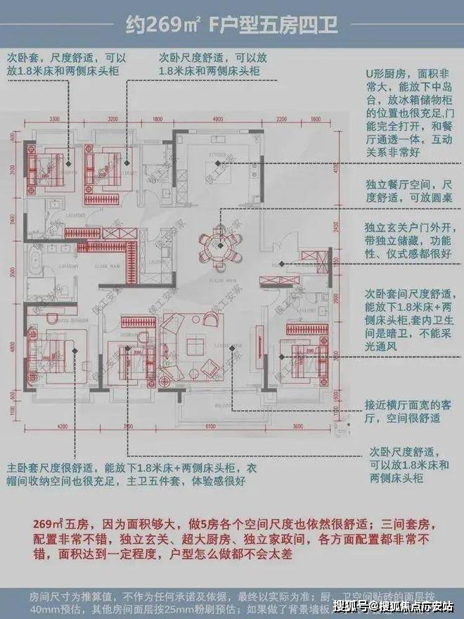 综合评价:269㎡五房,因为面积够大,做5房各个空间尺度也依然很舒适;三间套房,配置非常不错,独立玄关、超大厨房、独立家政间,各方面配置都非常不错,面积达到一定程度,户型怎么做都不会太差