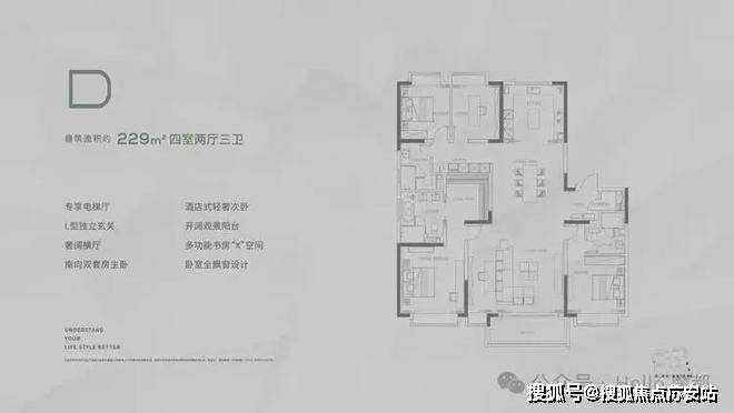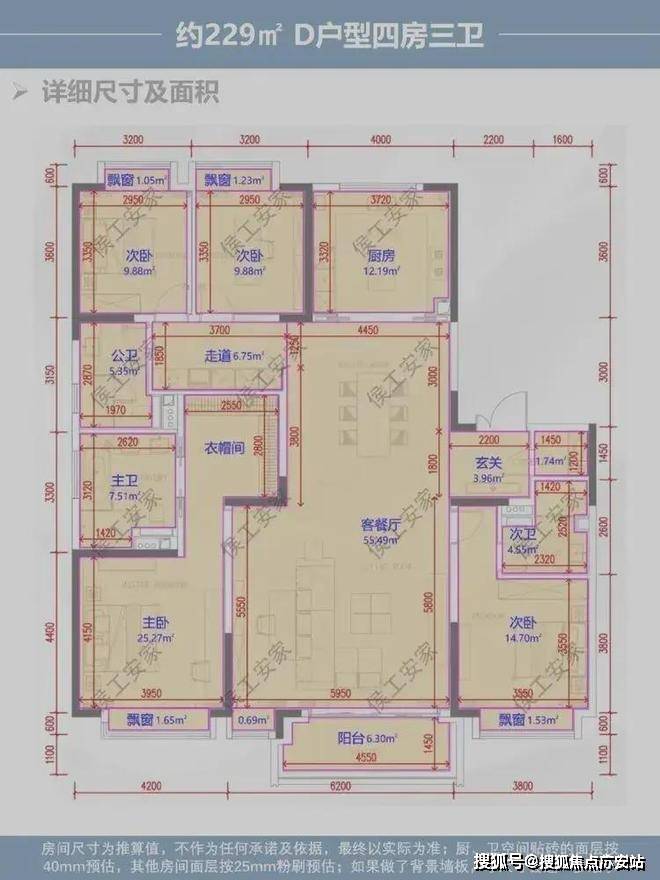 综合评价:229㎡的舒适四房,格局和A户型类似,只是房间尺度上有些差别,各个空间尺度也很充足,功能配置也很齐全,也考虑了洗衣空间,次卧套卫生间是暗卫,整体来说户型也很不错