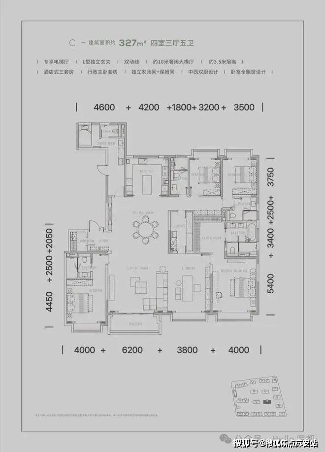 综合评价:253㎡的舒适4+1房,南向四面宽,各个空间尺度都很充足,功能配置也很齐全,还有独立的家政间,虽然次卧套卫生间是暗卫,但三卫有一个暗卫也属正常,整体来说户型还是非常不错