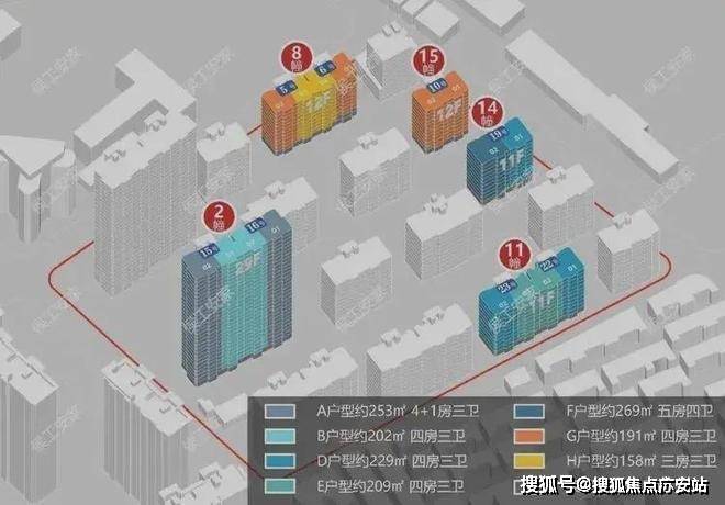 A户型约253㎡ 4+1房三卫56套;B户型约202㎡ 四房三卫56套;D户型约229㎡ 四房三卫30套;E户型约209㎡ 四房三卫 20套;F户型约269㎡ 五房四卫10套;G户型约191㎡ 四房三卫43套;H户型约158㎡ 三房三卫22套