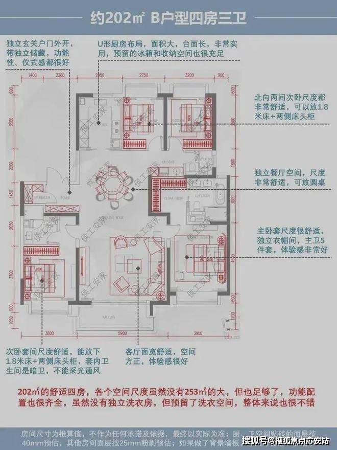 综合评价:202㎡的舒适四房,各个空间尺度虽然没有253㎡的大,但也足够了,功能配置也很齐全,虽然没有独立洗衣房,但预留了洗衣空间,整体来说也很不错