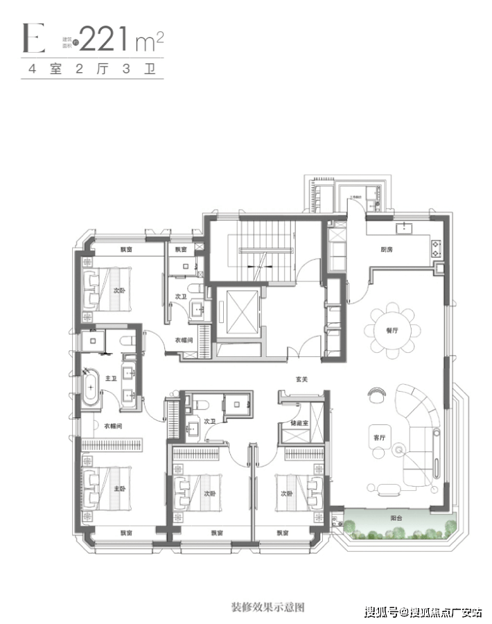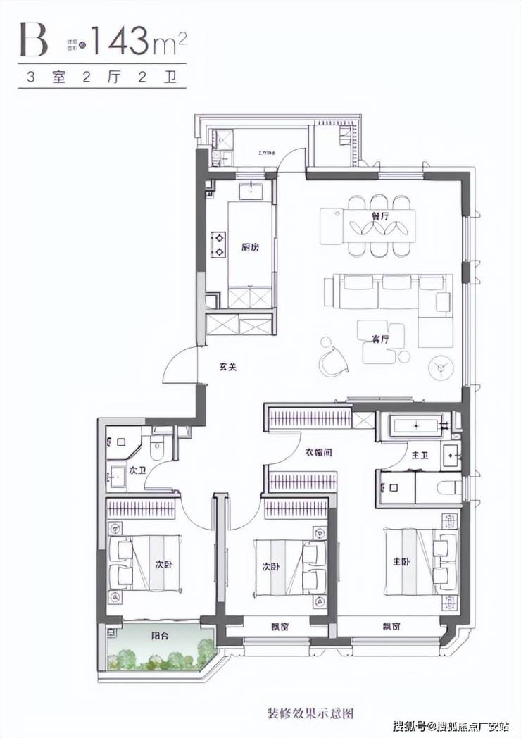2、143㎡户型,更大的空间尺度和舒适感。这种户型敢于“浪费”空间,用空间来换取心理上的尊贵感和舒适度,这种户型并非普通住宅,而是一种生活方式的宣言。