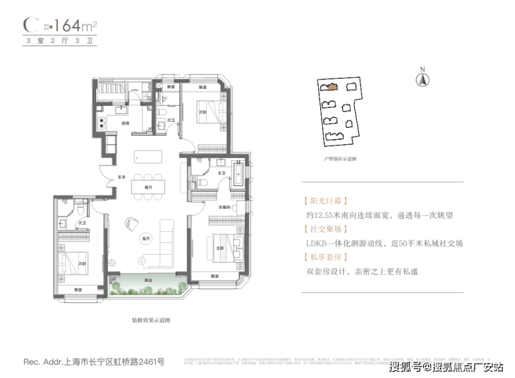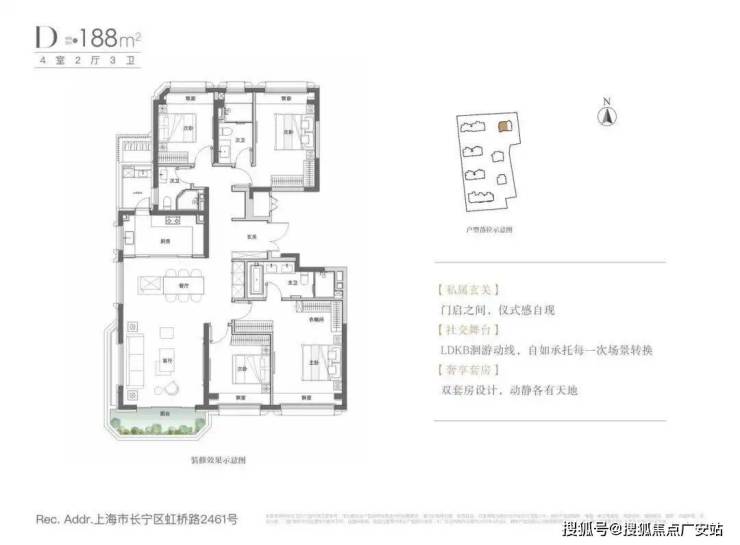 动静分离,市面上比较少真正的动静分离户型,这一户型就有效地将生活区和社交区分割开了,保证居家的静谧生活;