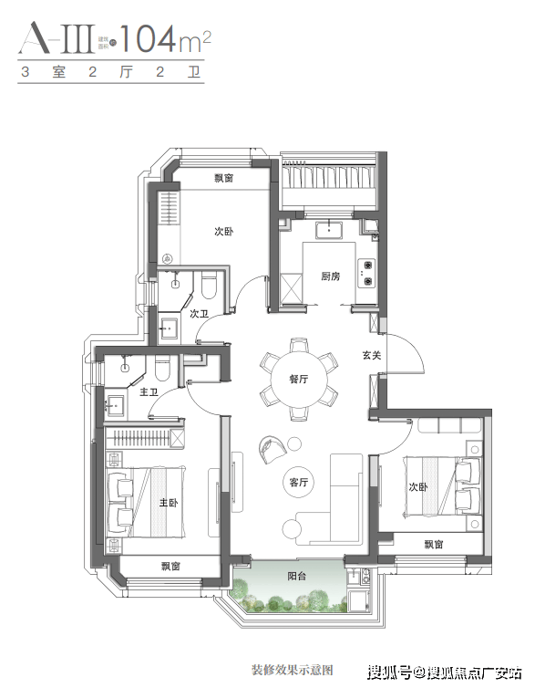 1、104㎡户型是功能性与空间的完美平衡,房间数量适宜。三室户型可以满足夫妻、孩子和一位老人/保姆/书房的多功能需求,实现了“一步到位”的家庭结构覆盖。