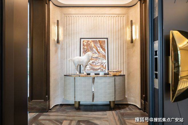 电梯厅的宠物识别按钮是艺术家定制款;入户门把手出自艺术家刘建华之手,用整块实心铜锭经锻造、打磨、电镀等多道精密工艺制成,握住的瞬间就是与艺术的触碰