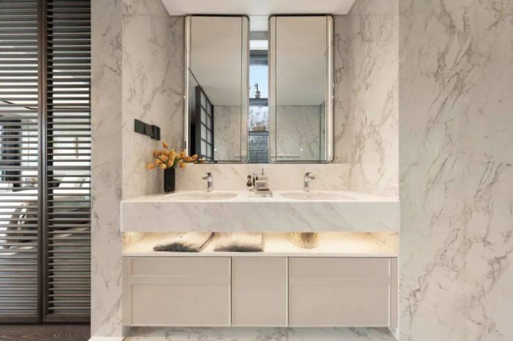 大量的雅士白大理石、大花白岩板、皇家孔雀岩板、水纹夹丝玻璃、仿洞石岩板、卡拉卡塔白岩板等等,极尽奢华!
