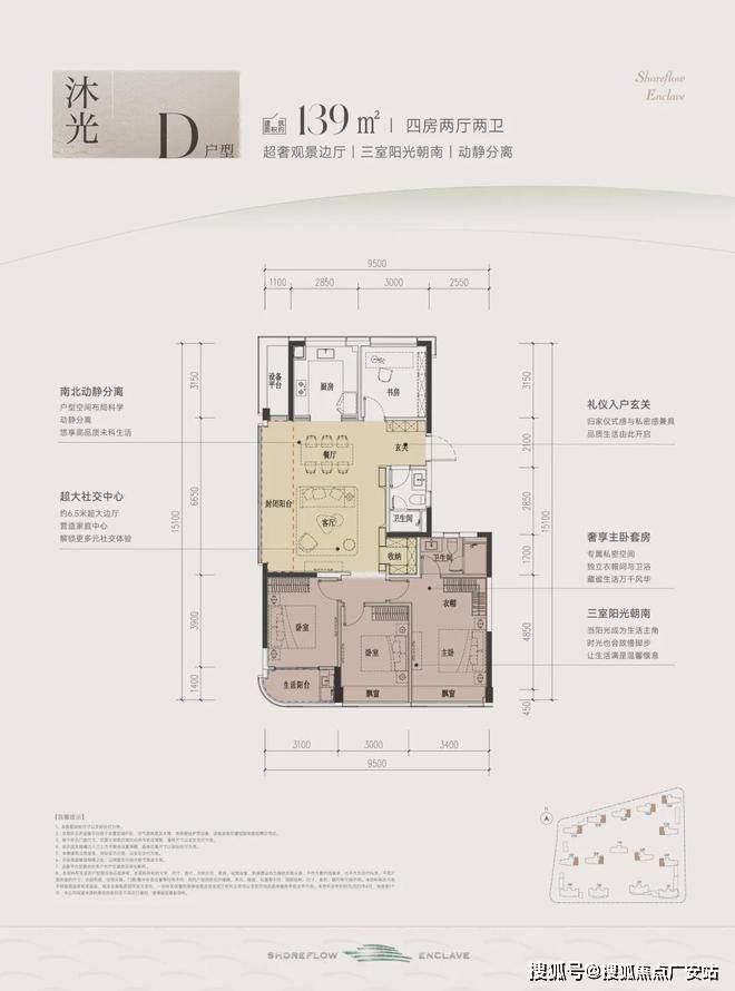 这款户型堪称四开间朝南的“流量王者”,南向面宽约13米,双联阳台+双飘窗设计,视野和采光优秀;套房主卧、双阳光次卧,颇有大平层的气势。