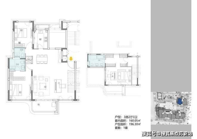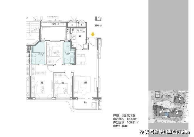 3地块容积率2.33,由一栋18层的小高层和两栋6层的花园洋房组成,共92套房源,产品建面约108-196㎡.