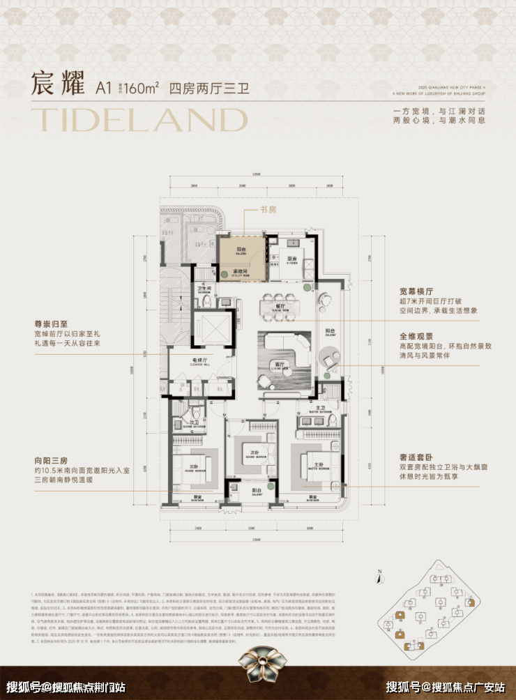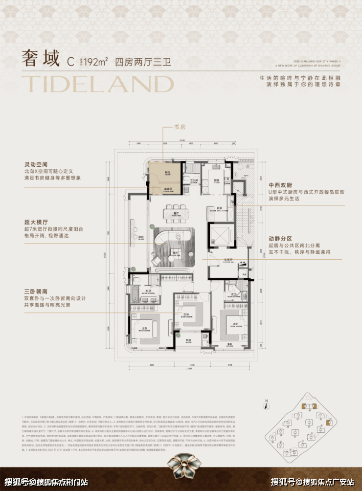 再看192方户型,更注重空间的包容性与场景多元。客餐厅一体化设计达到约49方,配合中西双厨配置,满足家庭聚会与社交宴会的需求。双套房设计增强了家庭成员间的居住私密性,而书房的270°采光面则极大提升了使用的舒适度与通透感。