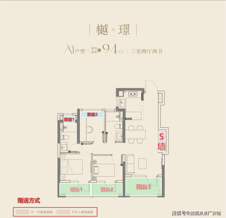 约94㎡起步户型:设计了市场上不多见的南向三阳台,凭借充足(约9%)的赠送面积,实现空间利用率最大化。