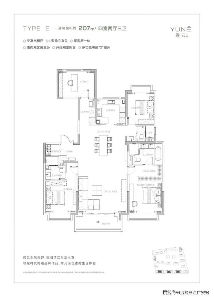 220-247㎡四房:约 7.5 米南向阳台,主卧套带独立衣帽间。