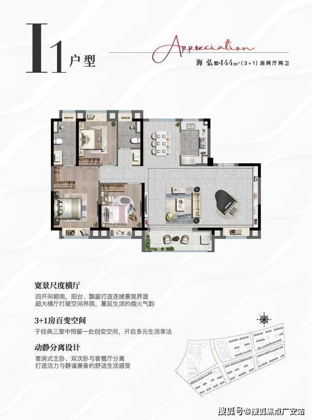 户型解析:宽景尺度横厅,四开间朝南,阳台、飘窗打造连续景观界面,超大横厅打破空间界限,蔓延生活的烟火气韵;