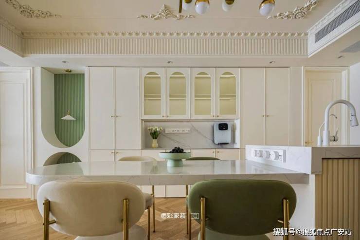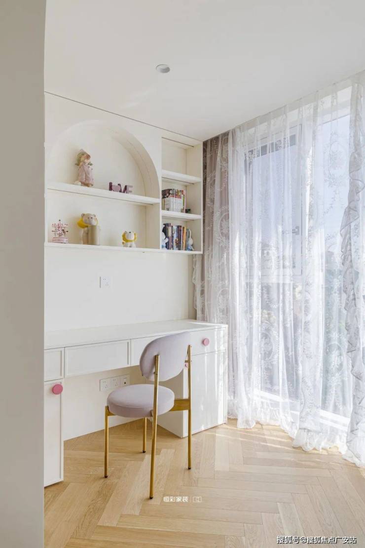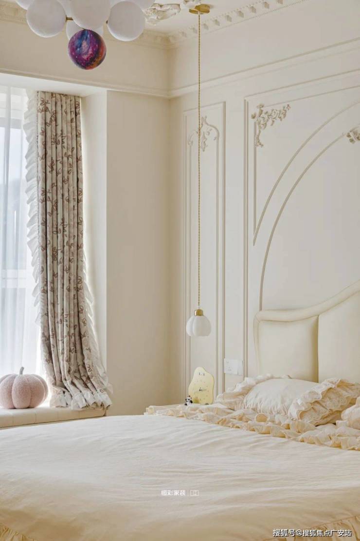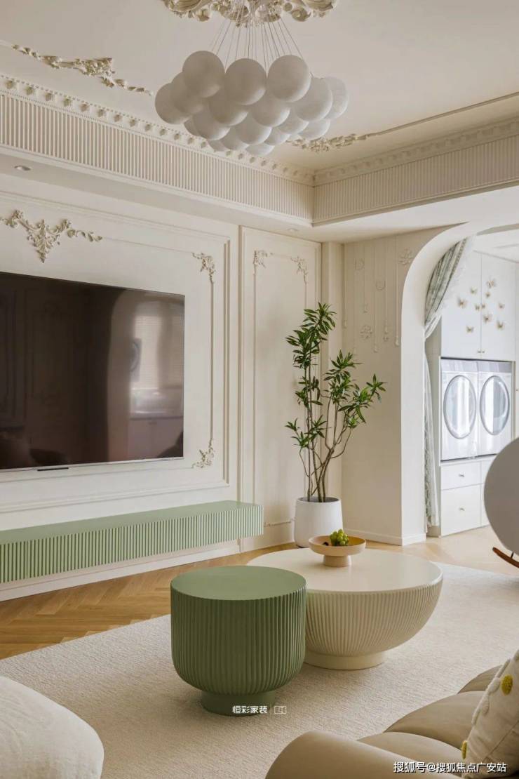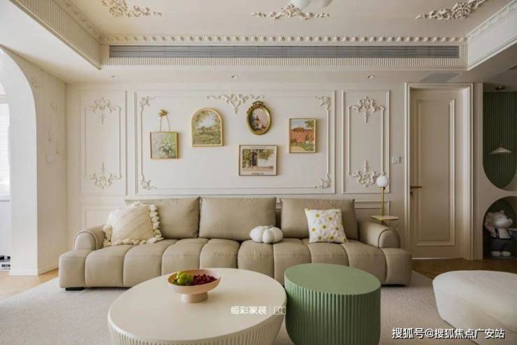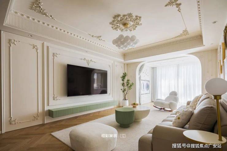 整个客厅淡奶油色为主,墙地面都是柔和的奶白色,拱形门洞搭配宫廷风角花更显温柔贵重,阳光正好时,透过纱帘点亮整个居家空间。