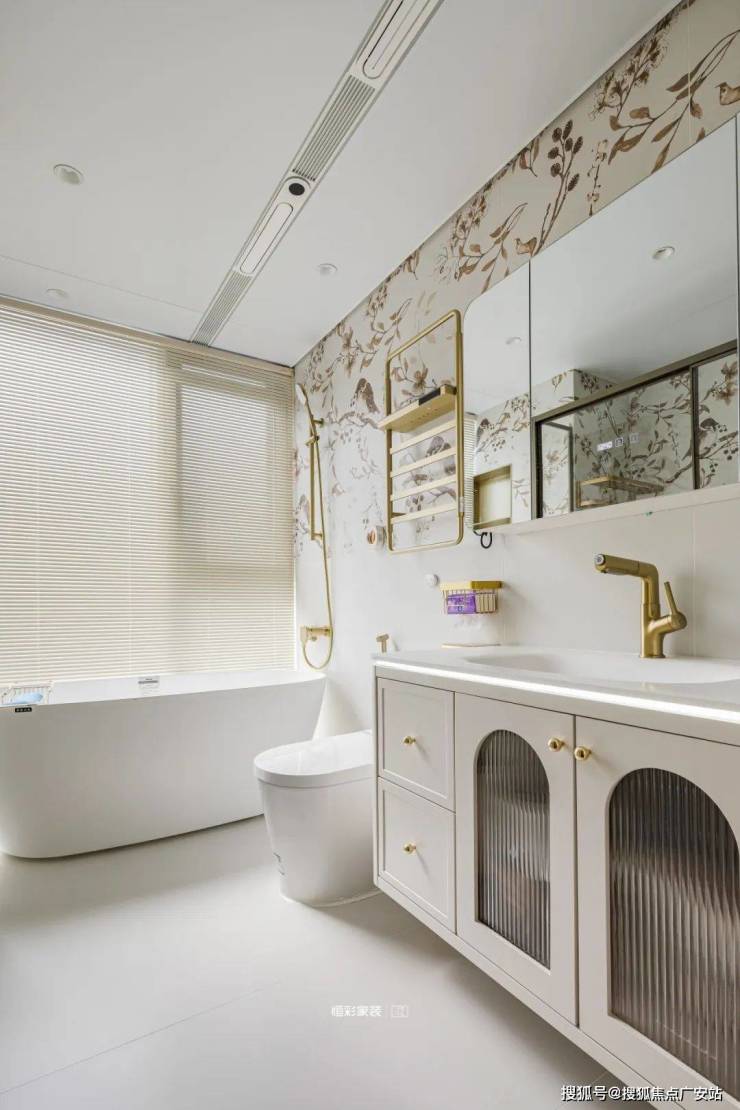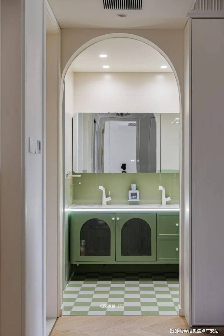 拱门造型的换鞋区多了圆润的弯角,看上去温柔又可爱,金色拉手柜门提升美观度。