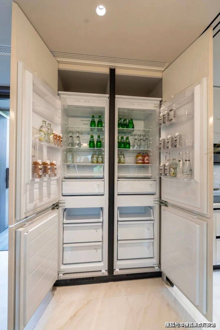 平嵌式冰箱,视觉上与墙面持平,观赏性强,使用上占地小、容量大,可满足一家日常生活所需。