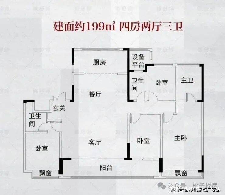 该户型图为四房三卫的格局,进门即独立玄关,仪式感强,还自带小储藏间,便于业主收纳、整理。南向连通阳台,采光视野都很不错。双套房设计,其中大套房带独立衣帽间。满足三代同堂的居住需求。