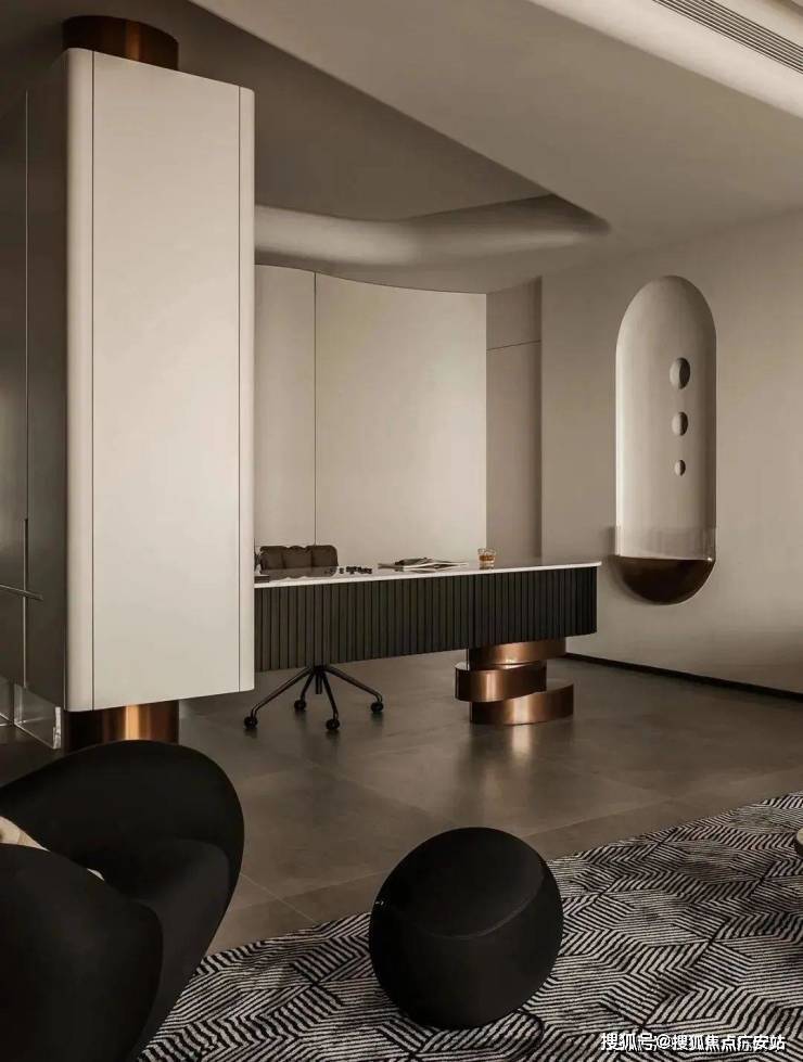 在玄关的后侧藏匿着一处茶室,黄铜色的金属桌脚略显奢华。