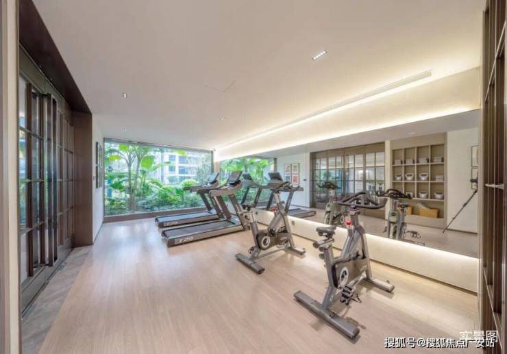 健身盒子则是属于撸铁爱好者的天堂,不仅分布着各种运动器械,无论风雨寒暑下楼就能运动,而且在空间营造上结合了大面玻璃设置,拥有独特的森林健身体验。