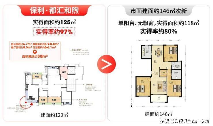 洋房标准层边套赠送面积约30㎡,实得率高达97%,相当于直接赠送约200多万价值,常规项目80%的实得率与之相比差距明显,该户型实际可享受常规155-160㎡的空间尺度。