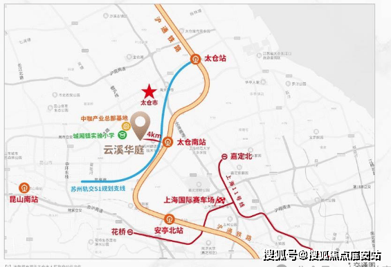 云溪华庭直线距离约4KM直达太仓南站(数据来源:百度地图),沪通高铁、沪宜高速两大立体交通网络接轨上海虹桥枢钮、上海嘉定等区域,此外,未来的苏州轨道S1支线(规划中)也有望串联太仓南站、太仓站,昆山到太仓的通勤时间将大幅缩短,上海轨交11号线也有望接入太仓南站(规划中)进一步提速虹桥北,未来热土新纪元。