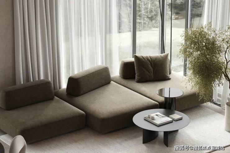 客厅中,设计师选用暖灰色作为空间的主色调,搭配上原木色的地板,奠定现代极简的空间基调。灰绿色的布艺沙发搭配上圆形的小茶几,展现出空间的几何美感。沙发旁摆放着绿植,为室内空间增添了一抹色彩,呈现出现代空间的生活美学。