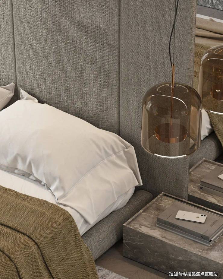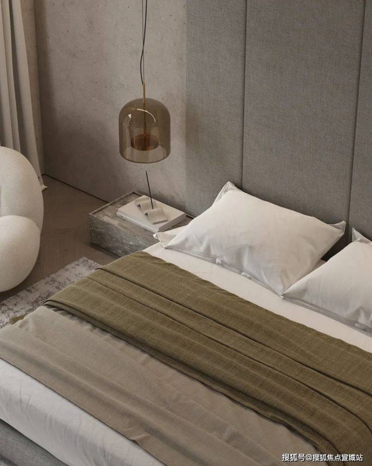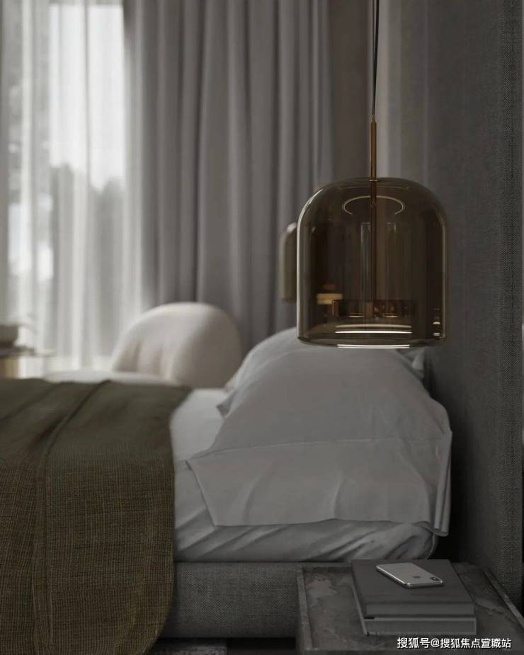 卧室中灰色的主色调与客厅相呼应,柔软蓬松的白色床品为屋主打造出了一个温馨舒适的休憩空间,床头柜选用灰色大理石,上方的床头灯则是金属与玻璃,不同材质的搭配让空间显得更加精致,富有美感。落地窗前的小沙发与茶几,能够让屋主在这度过舒适的下午茶时光。