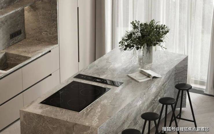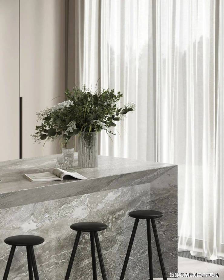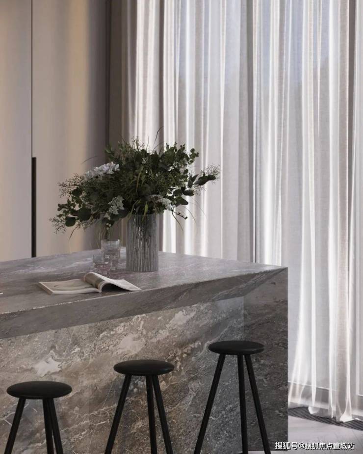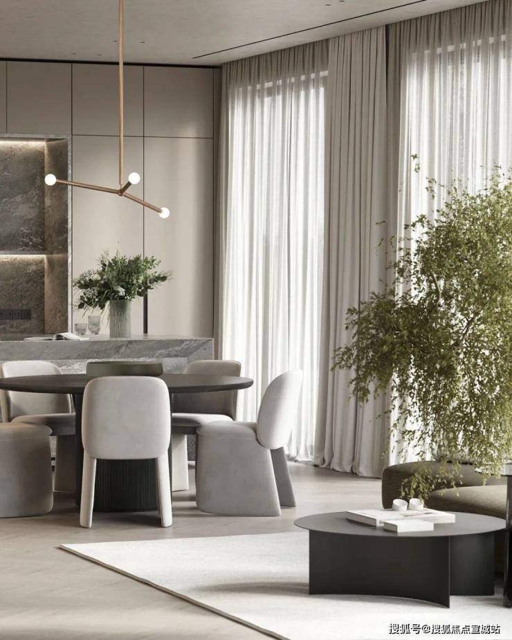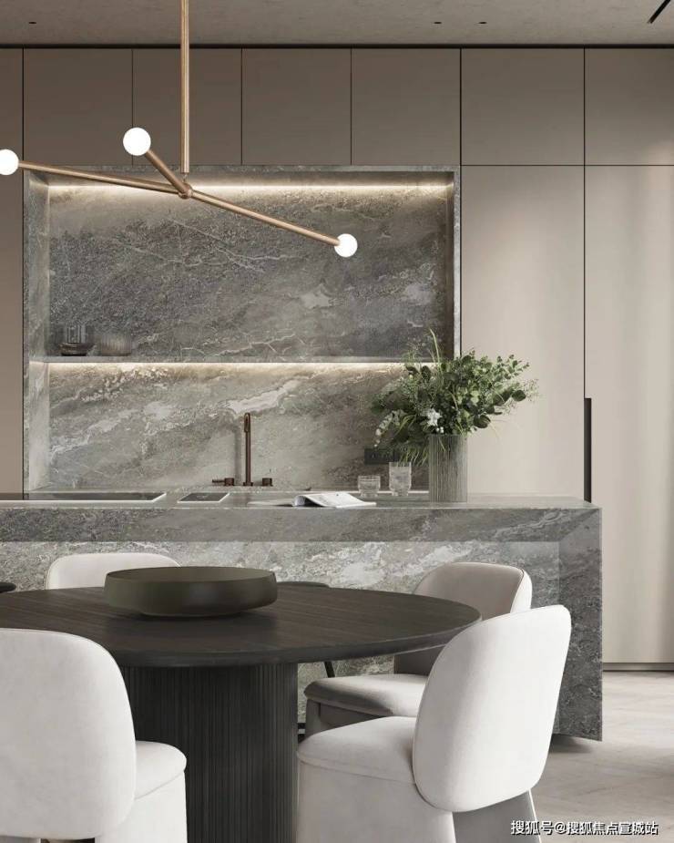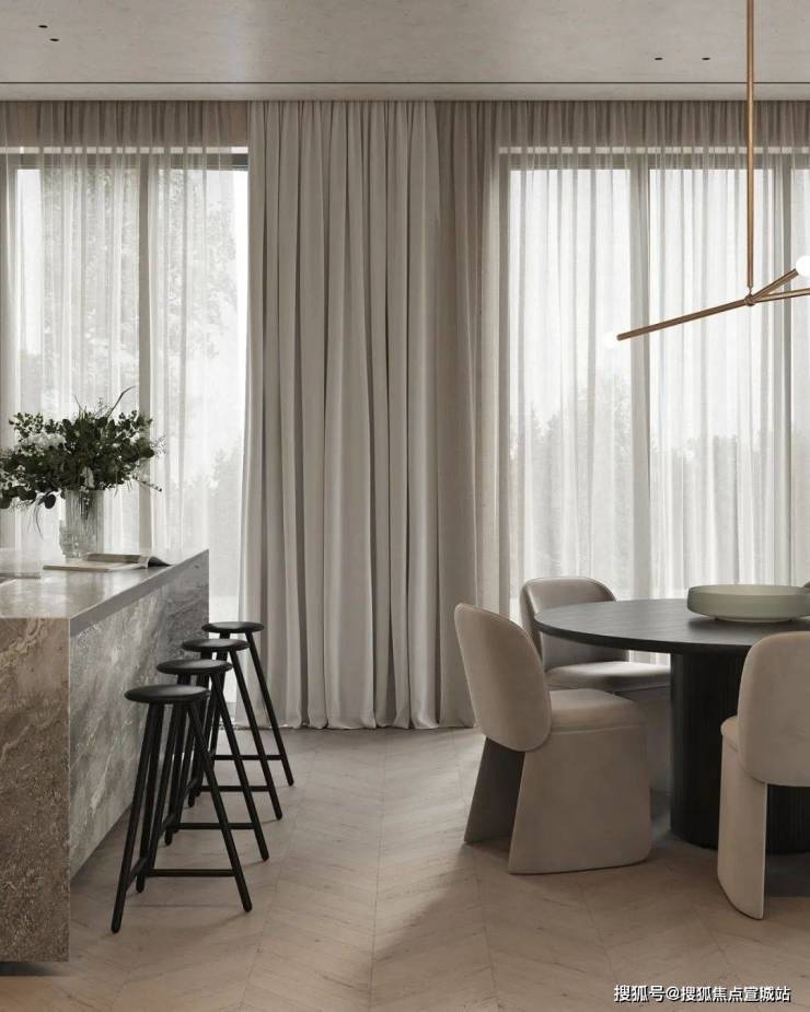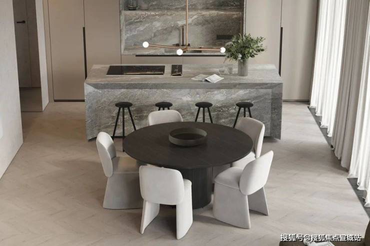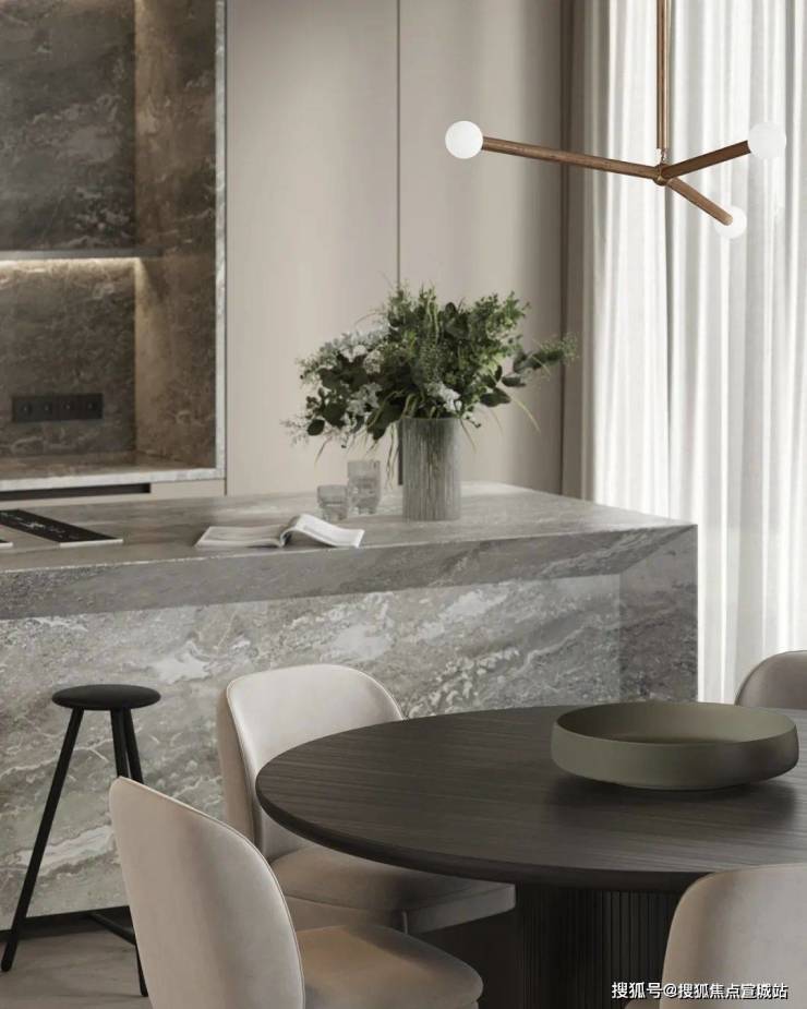 餐厅与厨房位于客厅的旁边,开放式的设计很好地利用了不大的公共空间,给人开阔的视觉感受。光线透过落地窗照入室内,让空间更加明亮。木质的圆形餐桌搭配上上方的金属吊灯,显得柔和而有质感。中岛台选用灰色大理石材质,与整体空间完美融合。