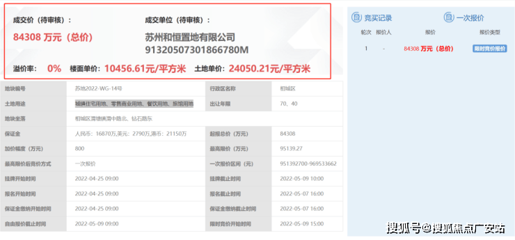 2022年5月9日苏州土拍中,苏州和恒置地有限公司(相城城投)以8.43亿元底价竞得,楼面价10456.61元/m²。地块性质为城镇住宅用地、零售商业用地、餐饮用地、旅馆用地。