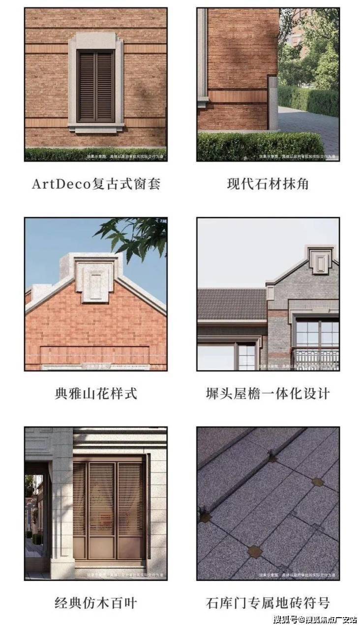 深入看细节,你会发现项目高颜值的6大新复古元素。包括Artdeco复古式窗套、现代石材抹角、典雅山花样式、墀头屋檐一体化设计、经典仿木百叶、石库门专属地砖符号等,用先锋表达回应在地文化。