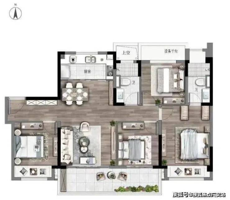 最令人惊讶的是它仅约125㎡的总建面,同时做到了4房2厅2卫、四开间朝南、三卧室朝南,而且得益于超高得房率,各功能空间面积分布均匀,丝毫不觉得拥挤;