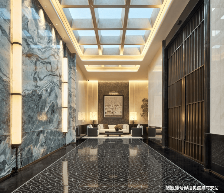 如果说清水样板房将激发未来别墅生活的无限想象力,那么实景示范区则将归家期待化为“沉浸式奢居体验”。从踏入别墅专属入户空间的那一刻起,尊崇感便渗透每一个细节:立面选用珍稀白玫瑰奢石,纹理灵动且自带温润光泽;地面铺设慕尼黑大理石,沉稳中尽显仪式感;顶部透光云石装置交织暖光,仿佛穿越光影秘境。