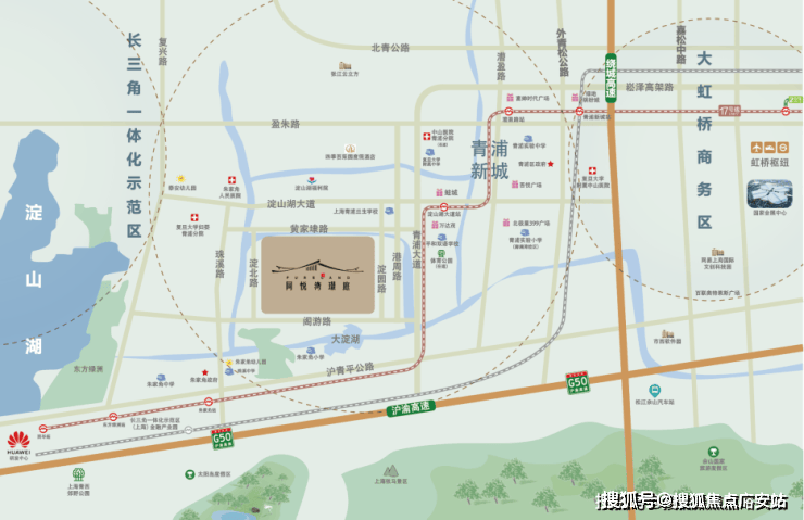 轨道交通:距离地铁17号线淀山湖大道站约2–2.5公里,未来示范区线通车后将进一步提升通达性