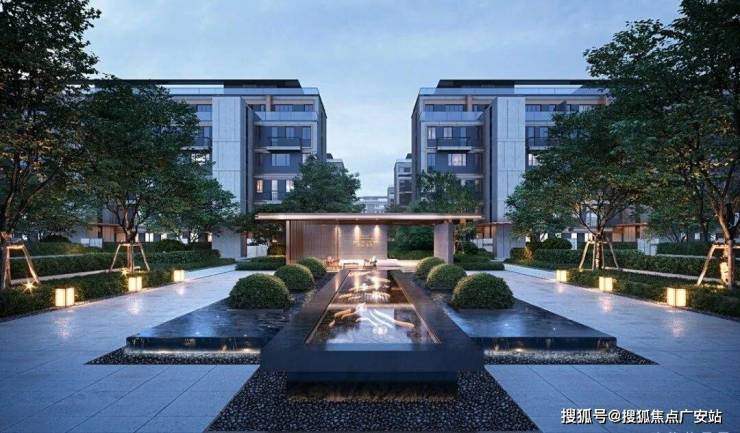 项目打造了南北双酒店式入户大堂,金属质感的造型景墙,配上璀璨的氛围灯,小区中轴曲水流觞,归家仪式感十足。