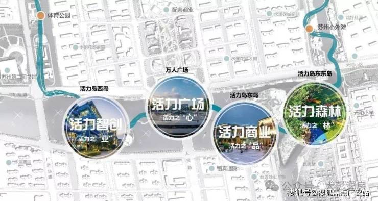 河道环绕、活力岛三岛景观、苏州小外滩