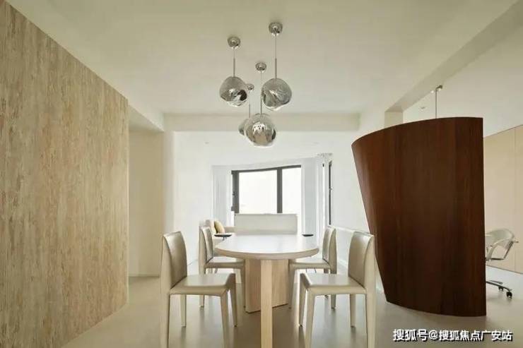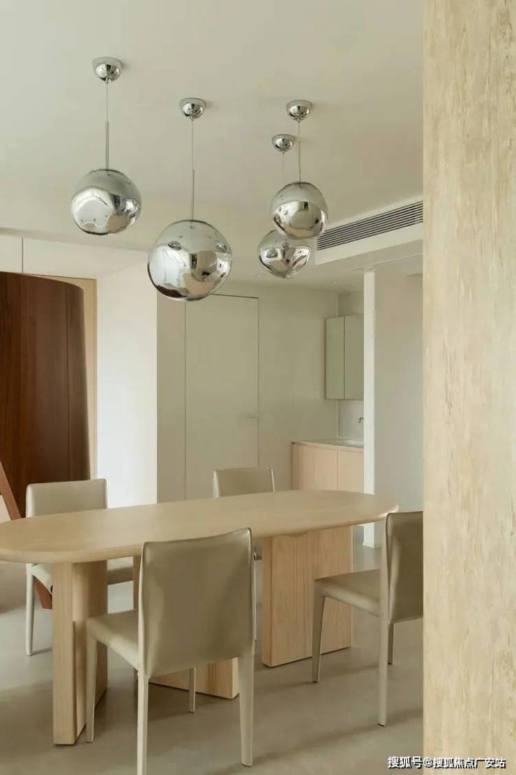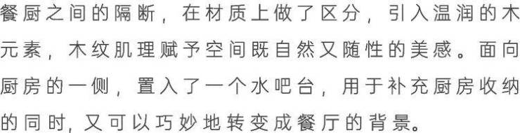 餐岛一体的组合,既满足了日常的功能需求,又在不经意间增添了隐形的收纳空间,避免了墙面柜体的直接储物功能,从而保持了空间的纯粹与宽敞。