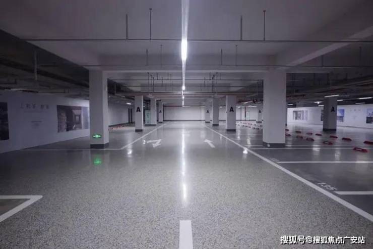 专利工艺打造高品质车库,车库地面材质选取整体浇筑磨石地坪、金刚砂停车位,经多道程序打磨地面,上固化磨光,最终达到地面光亮