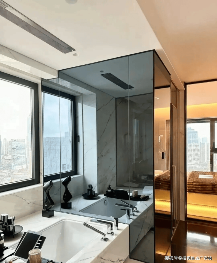 项目外立面上,以古铜色、深灰色等古典色调,配合大面积的玻璃、铝板等现代材质。通过竖向线条和立面层次,突出超高层建筑的挺拔姿态,整体与塔冠、基座形成不同层次的建筑体系。