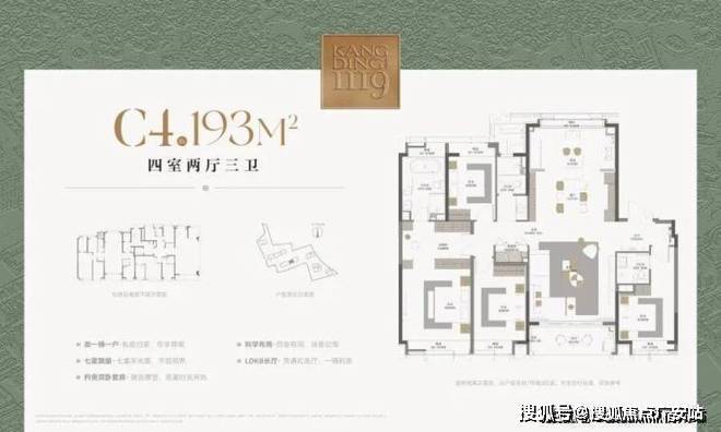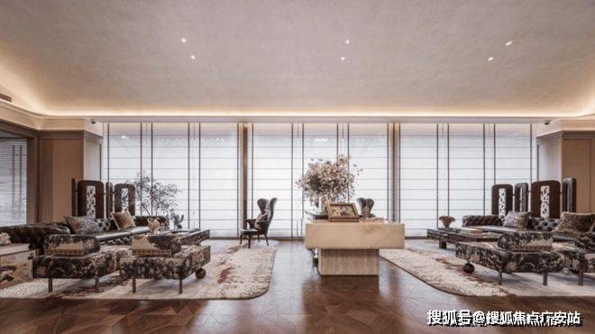 约17.2米环绕观景台:约238㎡户型的客餐厅,位于户型的顶端。自东向南环绕270度的观景台长达约17.2米,在这样的客厅,甚至可以踱步欣赏窗外的满眼梧桐。独立会客厅,可以做小茶室或棋牌,更深一步的隐私感,为专享客群定制。