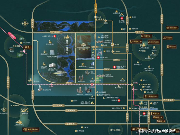 宝华紫薇花园直面约百万方桃浦中央绿地,如下图所示,是真正紧贴着绿地。