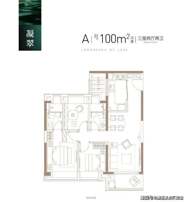 建面约100㎡3房2厅2卫, 做到了三开间朝南+主卧套房设计+动静分离+全卧室带飘窗,功能性和尺度感完美结合的3房户型。