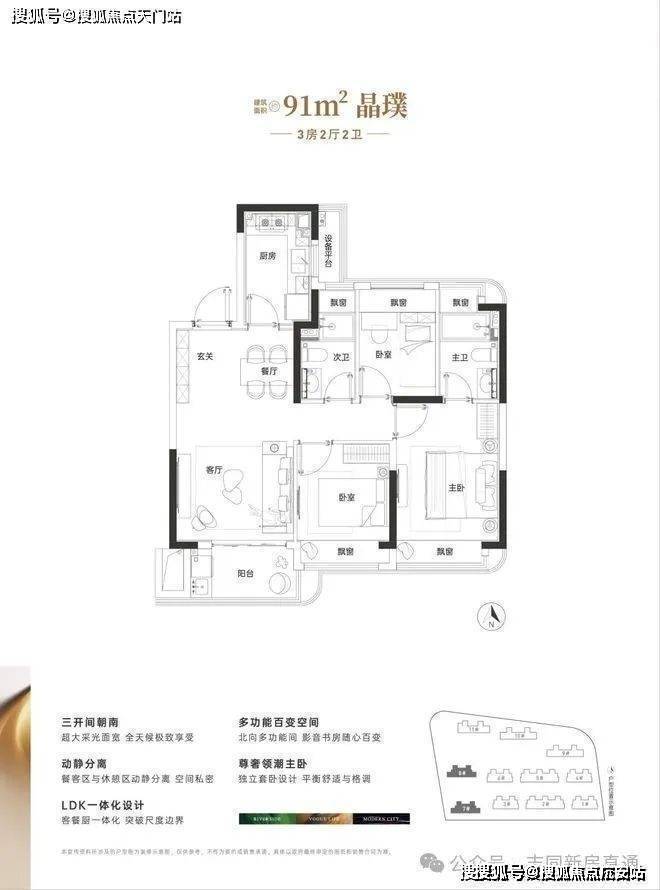 建面约91㎡做3房2卫,三开间朝南、3房5飘窗1阳台,整体室内的采光、视野以及通风都相当出彩。动静分离+主卧套房的设计,保证了整体居住的安静和私密性。